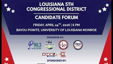 KEDM Public Radio, in collaboration with the Monroe and West Monroe - West Ouachita Chambers of Commerce and the University of Louisiana Monroe, will host a "Meet The Candidates" forum for Louisiana's 5th Congressional District. This free event will take place on Friday, April 24, at 6 p.m. at the University of Louisiana Monroe Bayou Pointe Event Center.