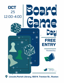 Come out and play board games at the Lincoln Parish Library! Learn some new games or bring your favorite to teach. Open to everyone.