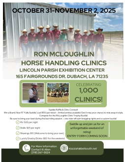 Ki Allen Riding School of Delhi is hosting Ron McLoughlin’s 1,000th clinic in Dubach, Louisiana. Ron is from Pearce, Arizona. He brings out the art of the horse industry with alternatives for training the horse for suppleness and obedience, and the rider