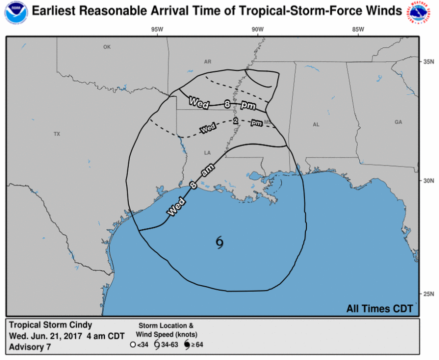 RAINFALL: Cindy is expected to produce rain accumulations of 3 to 6 inches with isolated maximum amounts up to 8 inches over extreme eastern Texas, Louisiana, and southern and eastern Arkansas through Friday morning. Additional rainfall amounts of 2 to 4 inches with isolated maximum amounts of 8 inches over southern Mississippi, southern and central Alabama, and extreme western Florida Panhandle are expected through Friday morning. This may bring storm total rainfall in excess of 15 inches in some isolated locations. This rainfall could cause life-threatening flash flooding in these areas.